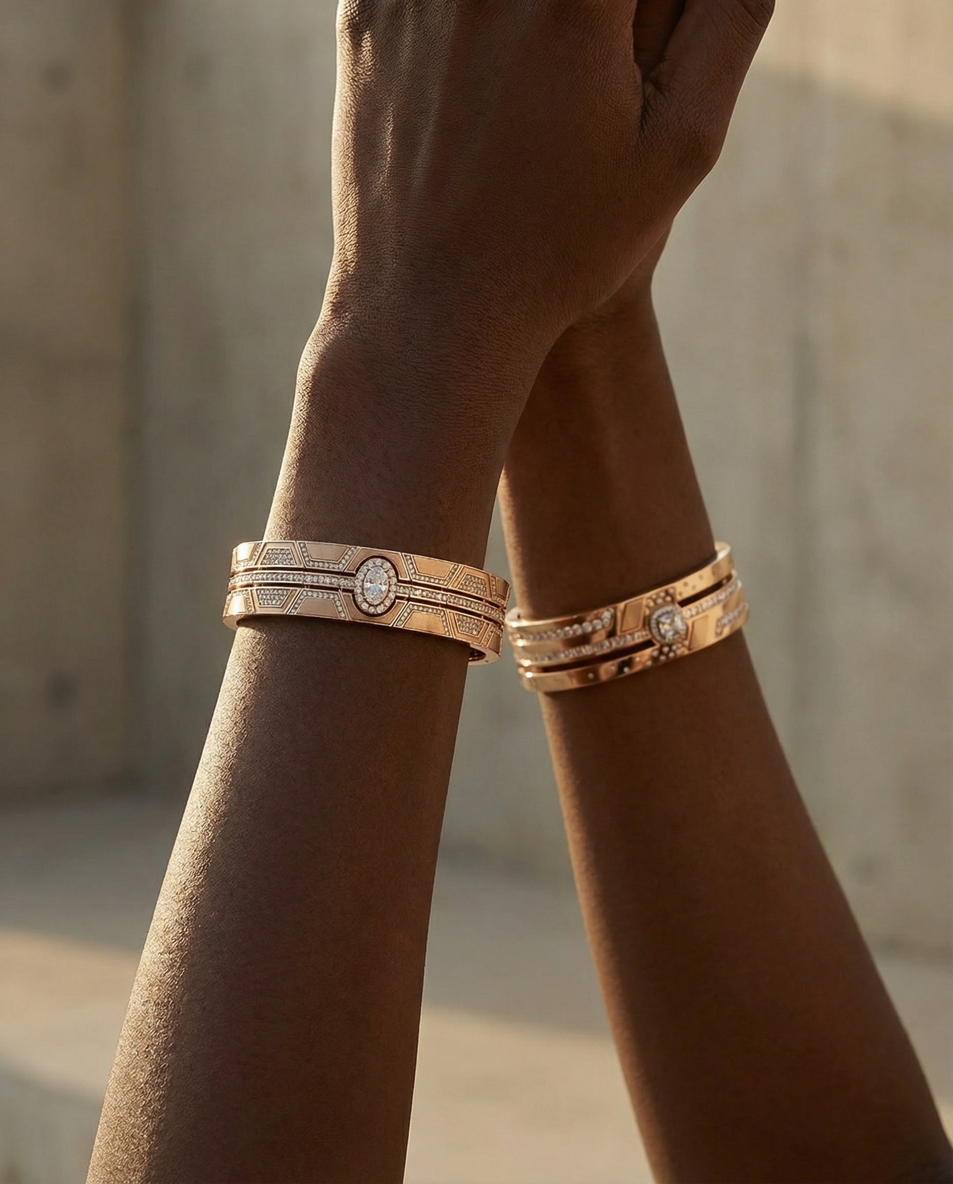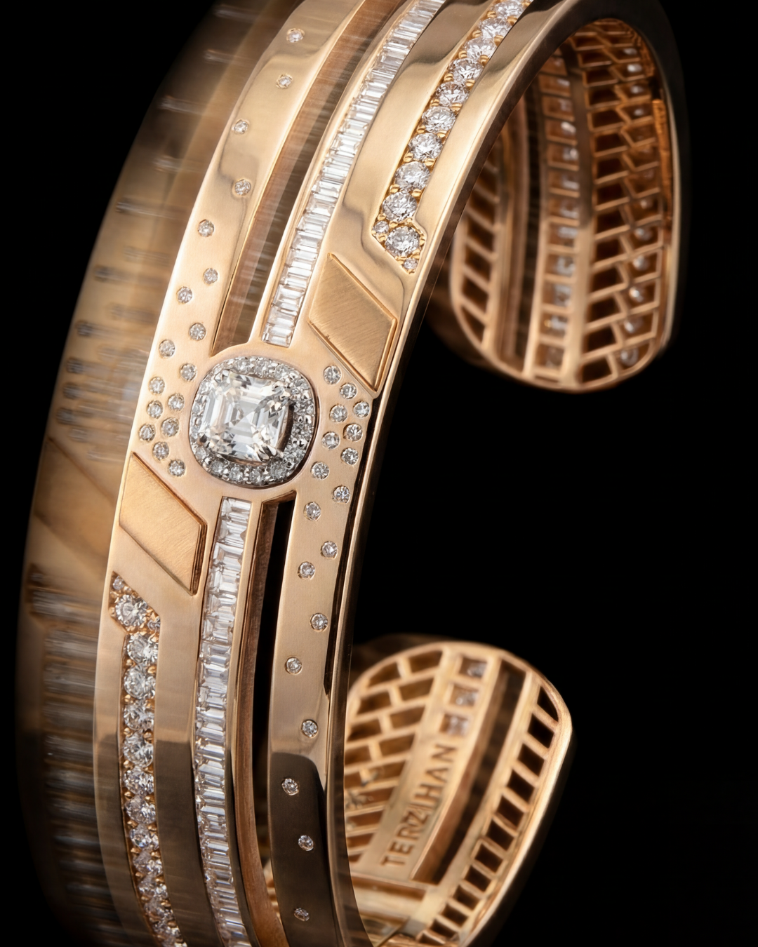 The Shield Double Cuffs transform Terzihan’s iconic emblem into high jewelry statements. Crafted in 18K rose gold and set with brilliant diamonds, their architectural silhouettes embody protection and power in perfect balance.