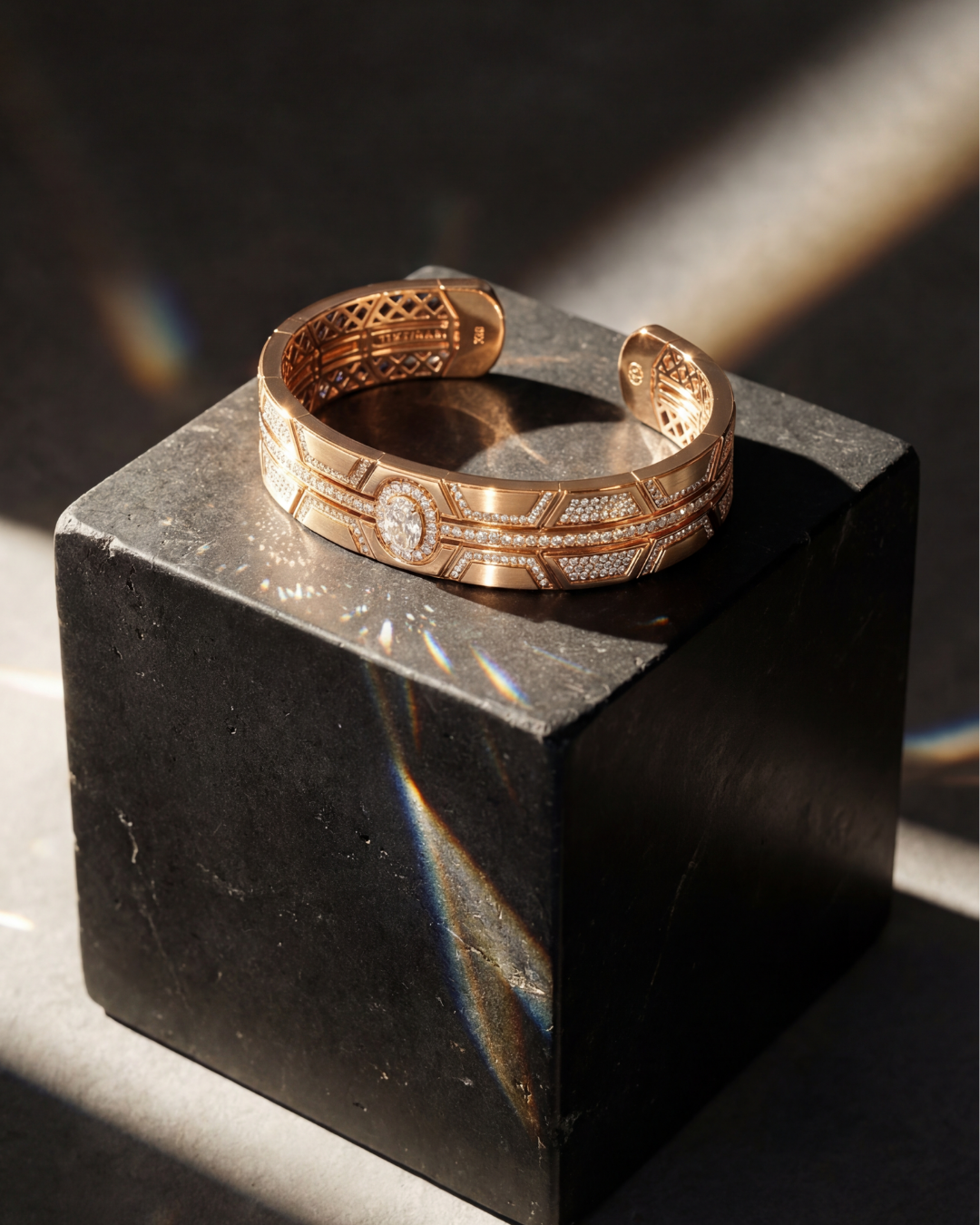One cuff features an oval-cut diamond solitaire — fluid and luminous.